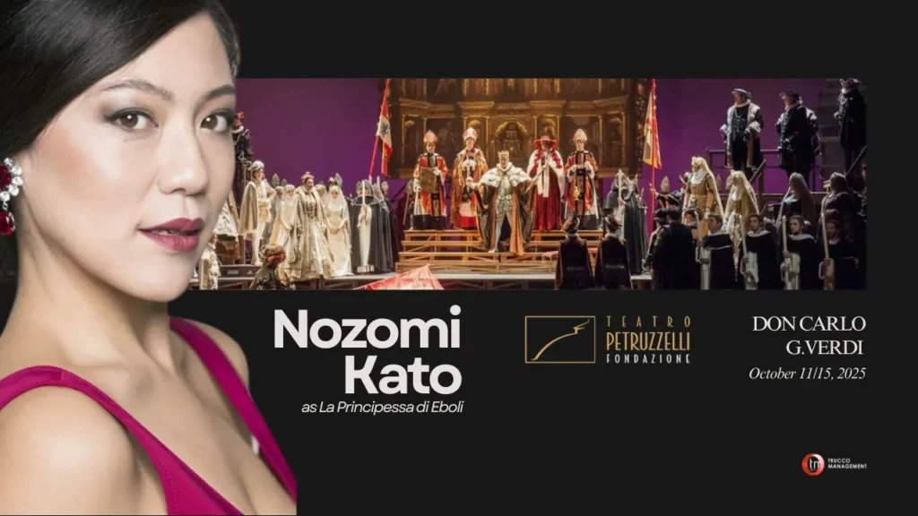 Nozomi Kato as Princess Eboli in Don Carlo at Teatro Petruzzelli  The Japanese mezzo-soprano Nozomi Kato joins the cast of Giuseppe Verdi’s Don Carlo at the Teatro Petruzzelli in Bari, performing the role of the Princess Eboli on October 11 and 15, 2025. This...